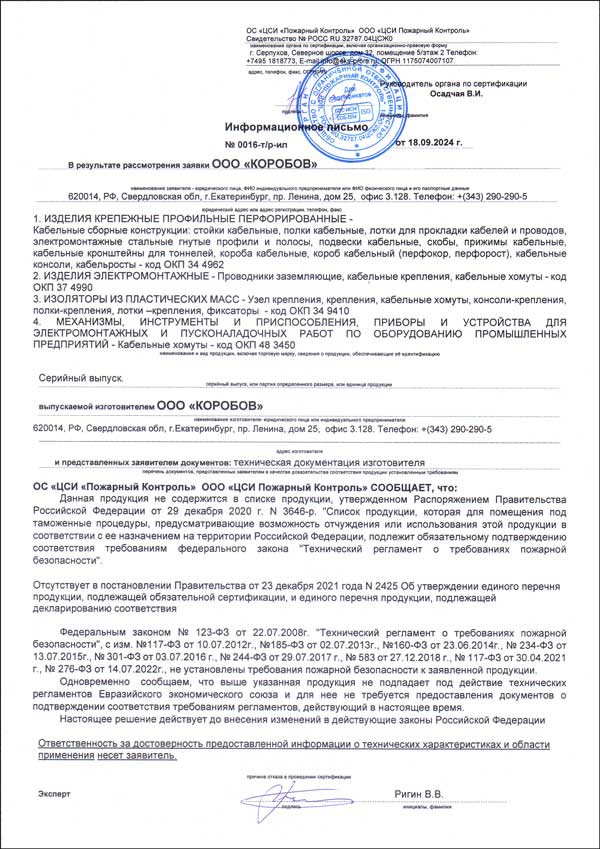 Отказное письмо о необязательной сертификации кабельных лотков