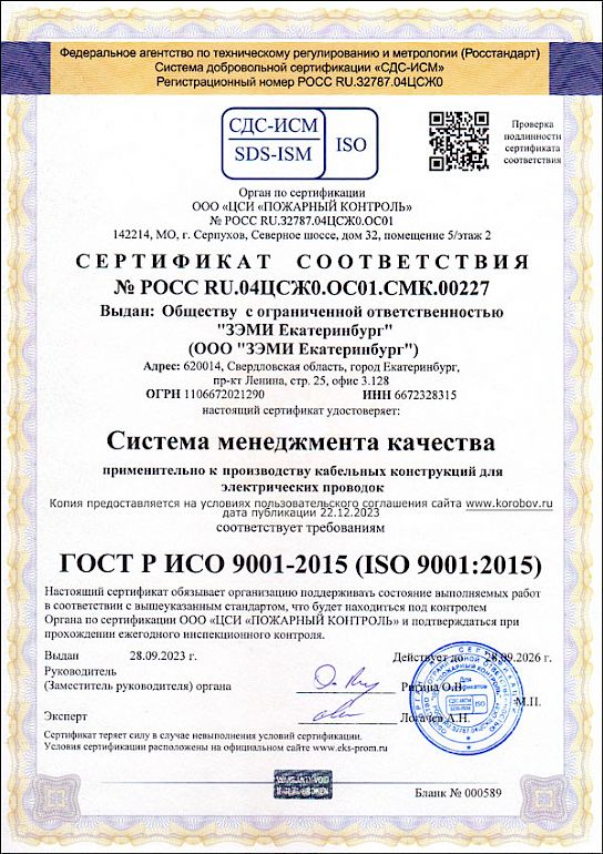 Сертификат ГОСТ Р МЭК 52868-07 КОРОБОВ (лотки и консоли) Сертификат ИСО 9001-2015 ISO 9001:2015 КОРОБОВ